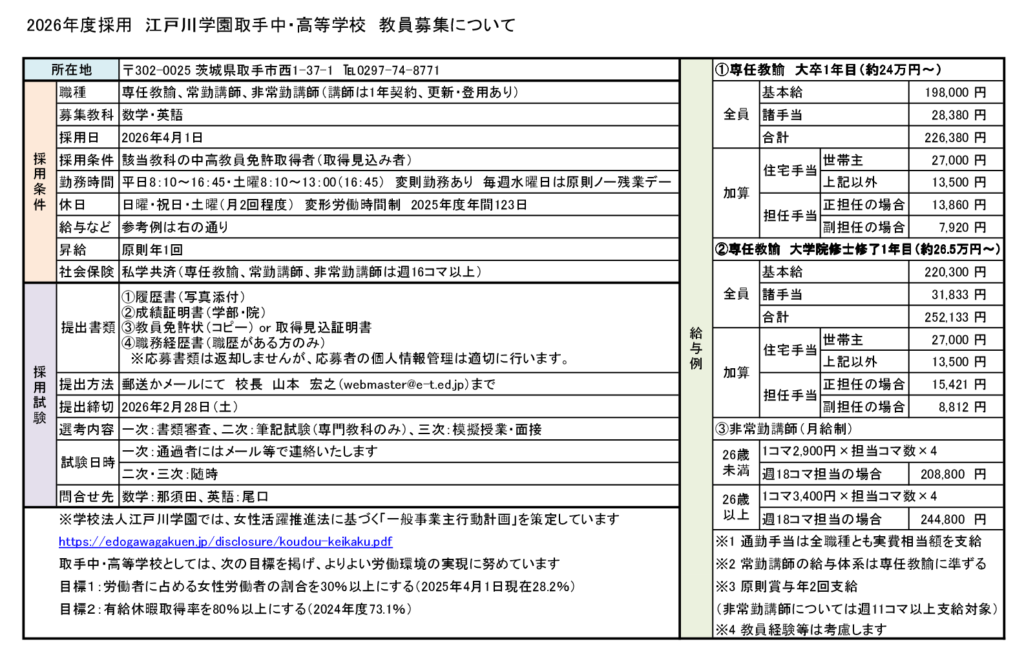 2026年度 数学・英語(専任・常勤・非常勤)