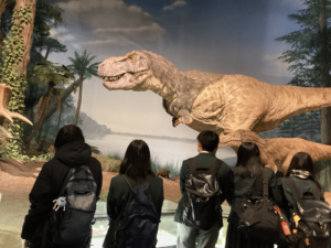館内では、恐竜や魚竜の再現展示が時系列に沿って配置されており、生徒たちはその流れを追いながら見学を行いました。まるで生きているかのように動く展示を通して、それぞれの生物が存在していた時代や環境を具体的にイメージすることができました。見学にあたっては授業で用いた地質年代表と照らし合わせながら観察を行い、授業で学んだ地球の歴史や生物の進化の流れを実感的に捉えることができました。教科書で学んだ内容が、連続した時間の流れの中でどのようにつながっているのかを体感する、貴重な学びの機会となりました。