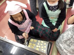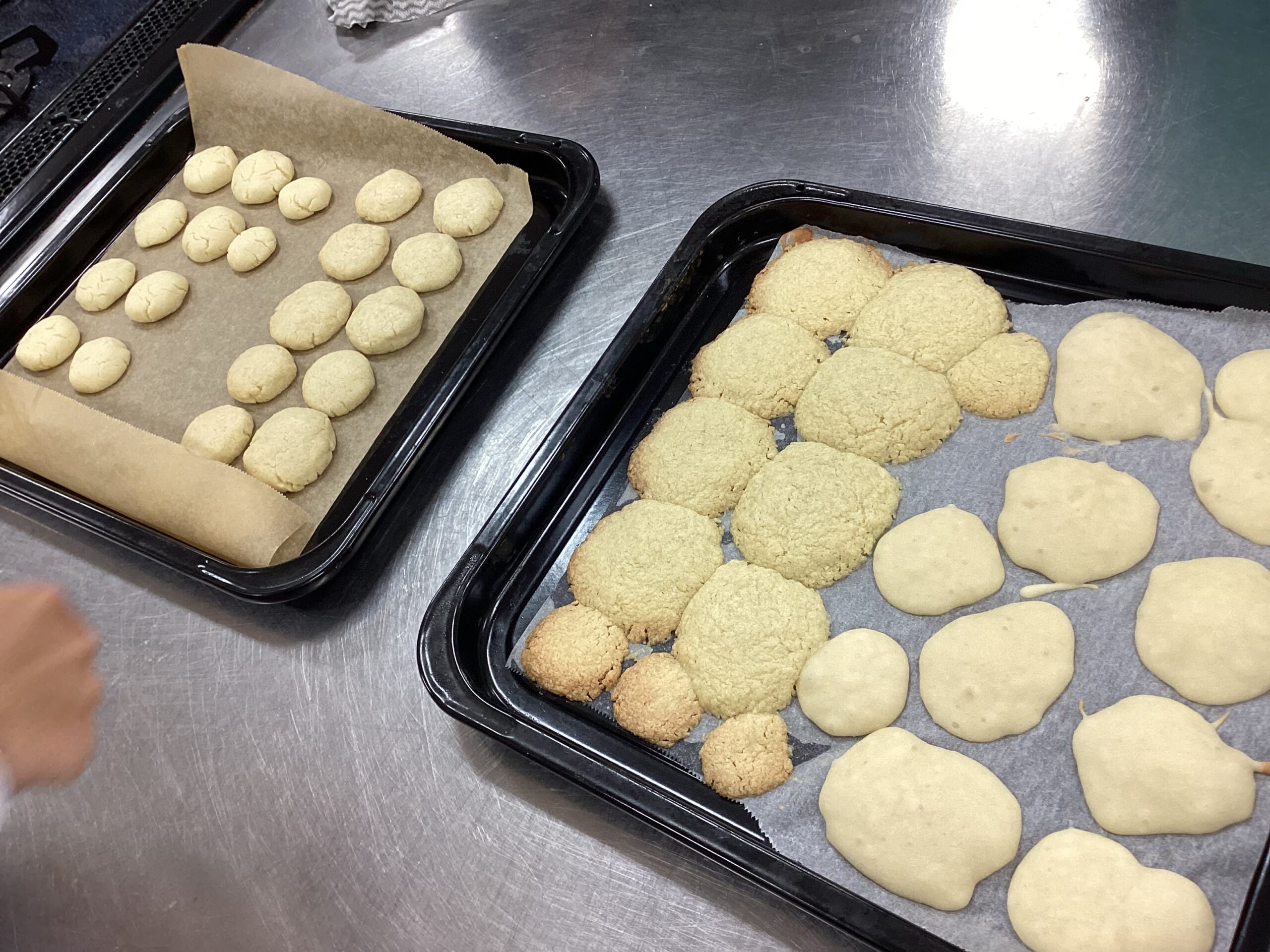 今回はその続編として、バター・サラダ油・油なしの3種類を比較し、油脂が生地のまとまり方や食感にどのような違いをもたらすのかを調べました。油脂には生地をほろっとさせる「ショートニング性」があり、種類の違いが焼き上がりに大きく影響することが観察できました。特に油なしは生地がまとまりにくいものの、焼くとパンのような素朴な味わいになることが分かり、材料の働きを実感する学びとなりました。