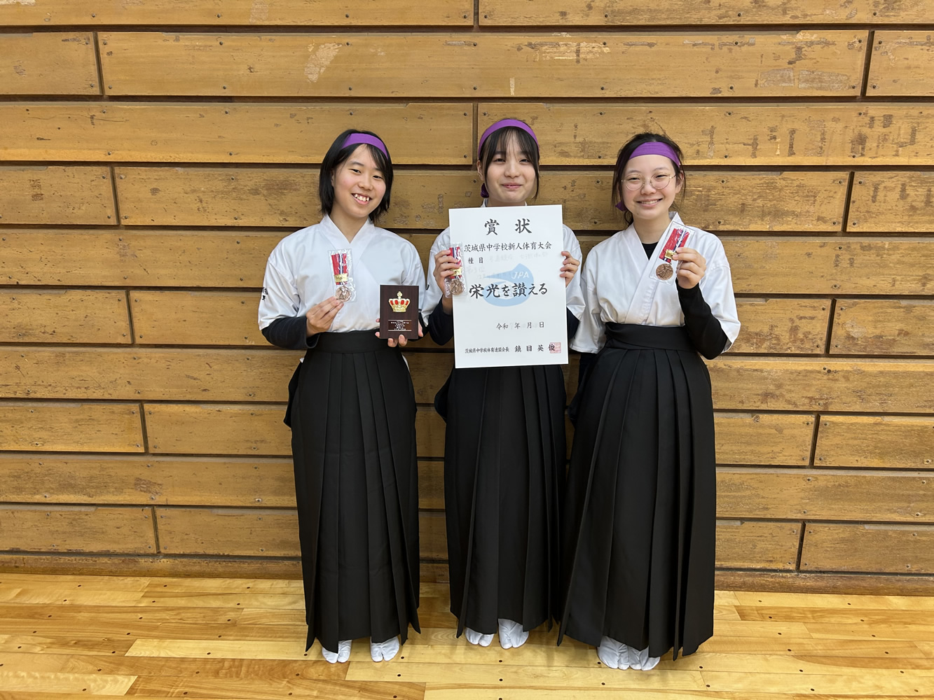 10月28日(火) にアルテンジャパン武道館で行われた、令和7年度茨城県中学校新人体育大会弓道競技の部において、女子団体3位(団体メンバー中等部2年Oさん、Sさん、Tさん)、中等部2年Tさんが女子個人4位を獲得しました。