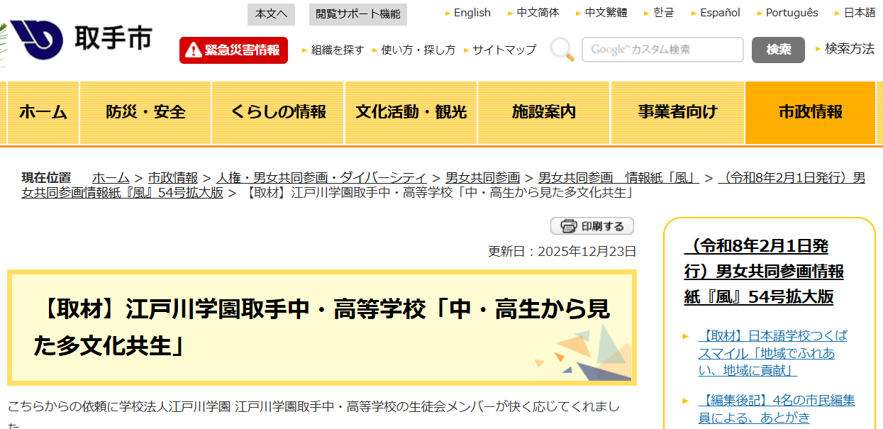 取手市/【はなしを ききました】「えどがわ がくえん とりで」ちゅうがくせい・こうこうせいから みる「たぶんか きょうせい」