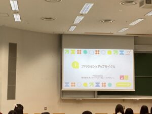 午後のワークショップでは、他校の高校生と混合チームを組み、希望した企業のテーマに取り組みました。本校生はオンワードコーポレートデザイン株式会社の取り組みを題材に「アップサイクル」をテーマとしたディスカッションに取り組みました。短い時間ながら意見交換とまとめを行い、模造紙を用いて全体発表まで実施しました。