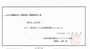販売で得た利益と会場で寄せられた募金はすべて、フードバンク茨城とフードバンク能登に寄付しました。両団体からは、寄付金を支援活動や運営費として大切に活用する旨の報告と温かいお礼の言葉をいただいています。フードバンク能登からは、昨年に続く支援への感謝と、被災地の方々に想いが届いていることを伝えるメッセージも寄せられました。