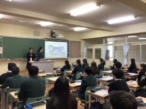 生徒たちは発表者の生徒によるプレゼンを高い興味や関心を持って聴いていました。生徒が発表したスライドは,今後校内に掲示予定です。ご来校の際にぜひご覧ください。