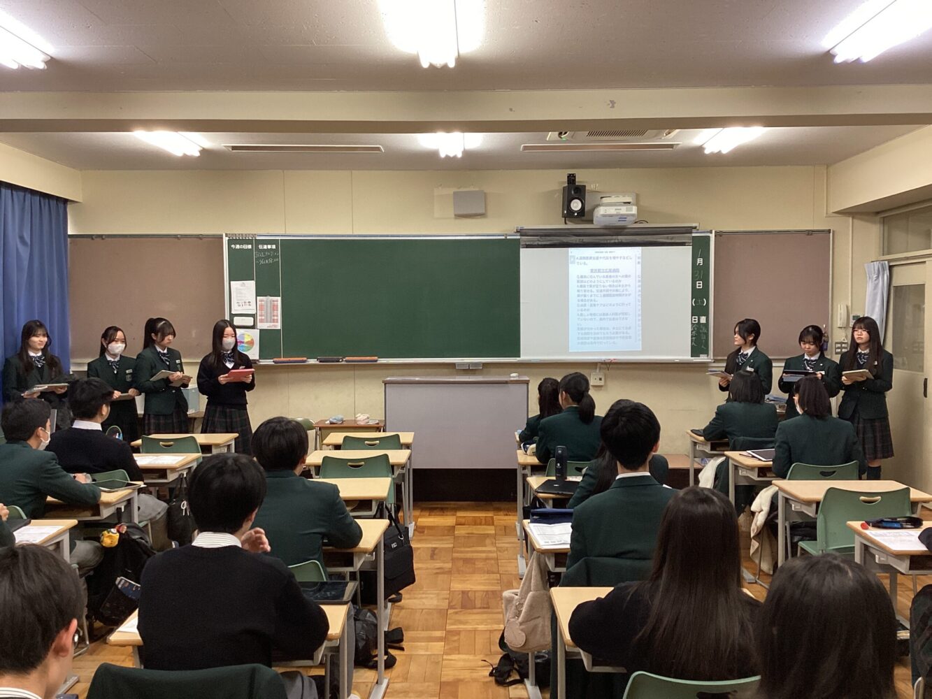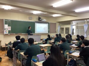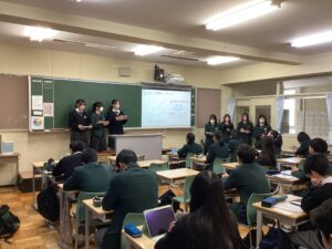 生徒たちは発表者の生徒によるプレゼンを高い興味や関心を持って聴いていました。生徒が発表したスライドは,今後校内に掲示予定です。ご来校の際にぜひご覧ください。